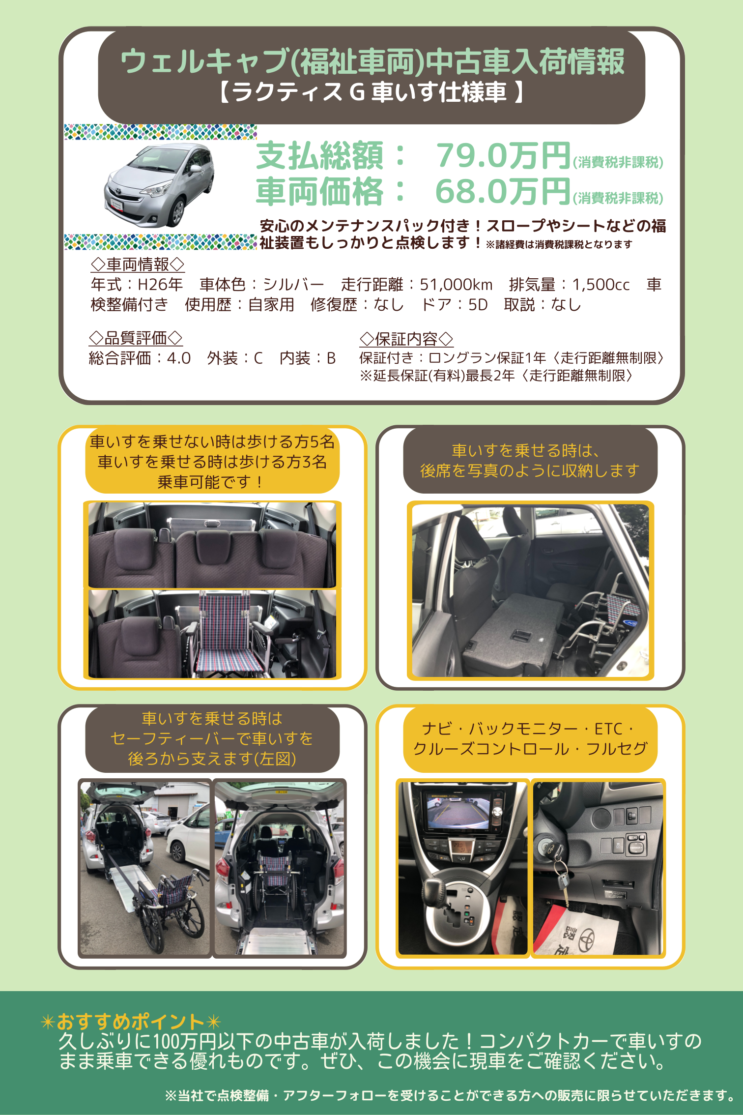 久しぶりに100万円以下の中古車が入荷しました!コンパクトカーで車いすの  まま乗車できる優れものです。ぜひ、この機会に現車をご確認ください。